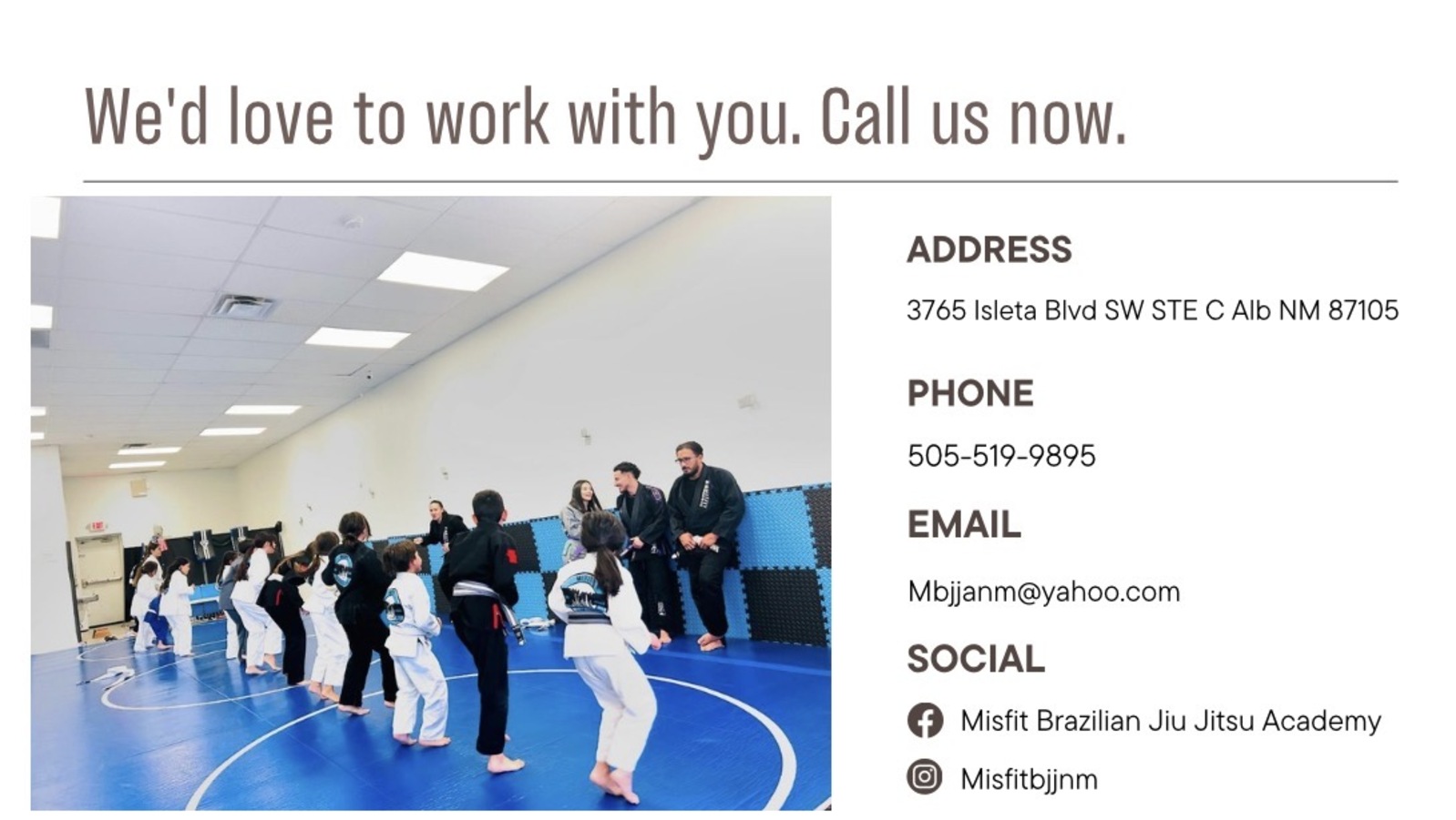 Thank you for your interest in Misfit Brazilian Jiu Jitsu Academy. We will get back to you as soon as possible. Please note we are closed on Sundays. Have a blessed day and talk to you soon!