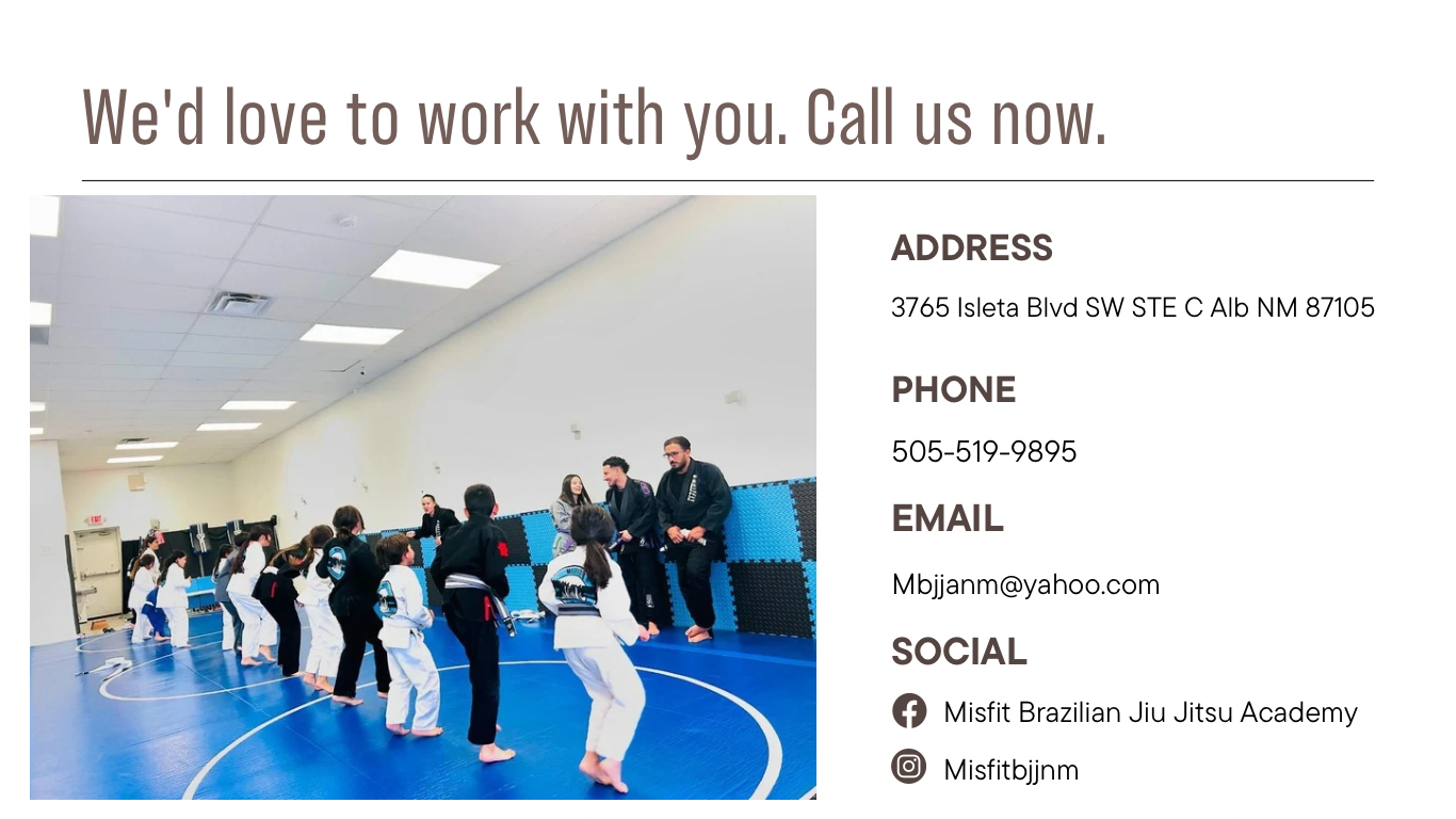 Thank you for your interest in Misfit Brazilian Jiu Jitsu Academy. We will get back to you as soon as possible. Please note we are closed on Sundays. Have a blessed day and talk to you soon!